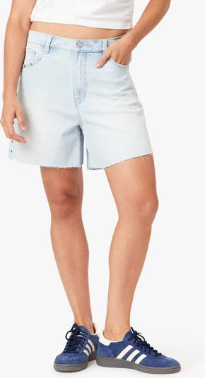 A high-rise waist complements the slouchy silhouette of these low-stretch denim shorts trimmed with glossy studding and cast in a faded wash.