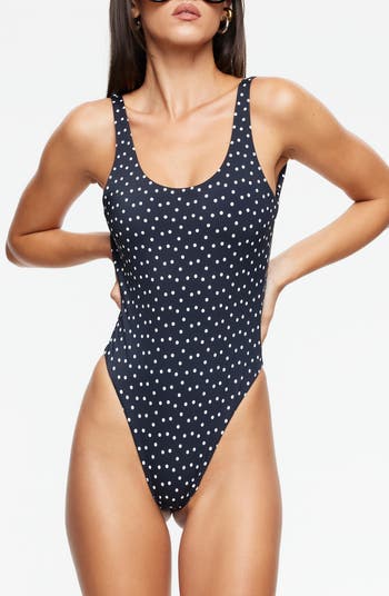 Dive into playful polish with this retro-tinged one-piece swimsuit cut with a clean scoop neckline and dramatic low back worthy of golden-hour pool photos.