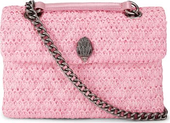 A signature crystal-encrusted eagle head highlights the raffia exterior of a structured bag suspended from a pull-through chain strap that converts for shoulder or crossbody wear.