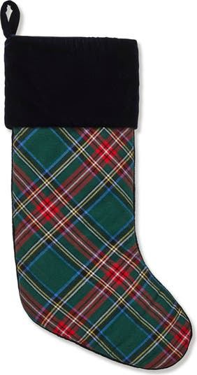 A soft velour cuff details a timeless holiday stocking patterned in colorful tartan plaid.