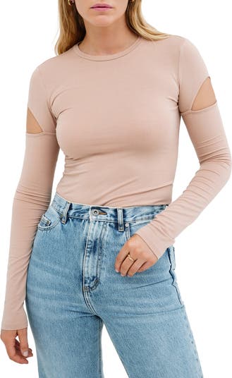 Triangular cutouts at the sleeves add an edge to this figure-hugging long-sleeve top made from lightweight stretch jersey.