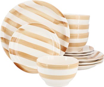 The Gibson Home Kenwood Shores 12 Piece Stoneware Dinnerware Set brings a blend of artisanal charm and everyday functionality to your dining table. Crafted from durable stoneware with a glossy finish, this set features a handpainted stripe pattern that adds a touch of rustic elegance to any meal. Designed for service for four, it includes four 10.5-inch dinner plates, four 7.5-inch dessert plates, and four 5.5-inch cereal bowls, making it perfect for casual family dinners or entertaining guests. The round shape and carefully crafted design create a cohesive and inviting table setting. Practical as well as stylish, this dinnerware set is both microwave and dishwasher safe, ensuring easy heating and effortless cleanup. The high-quality stoneware construction offers long-lasting durability, while the handpainted details provide a unique and artistic appeal. Whether you're serving a hearty breakfast, a light lunch, or a formal dinner, the Gibson Home Kenwood Shores set enhances every dining experience with its balance of beauty and convenience.