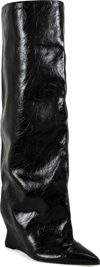 A wide shaft that can be worn straight or slouchy adds to the futuristic vibe of this pointed-toe boot grounded by a sculptural wedge heel.