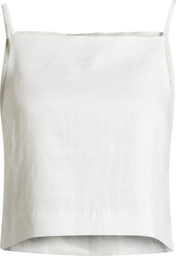 A sharp square neck accents this boxy cropped tank suspended by slender straps and cut from crisp linen.