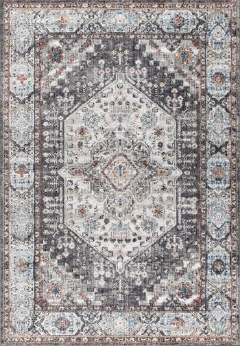 Based on a timeless medallion rug design, Kesan has been updated with a modern charcoal gray and ivory color palette. A central medallion in gray and ivory sits on a mingled charcoal background. Orange accents and a medallion border complete the design. Varying shades of color create a worn, vintage look.