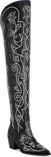 Western-inspired embroidery romances with roses and hearts on this pointy toe boot that soars over the knee.