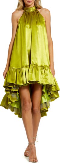 Keyhole High Neck Satin Ruffle Hem Mini Dress