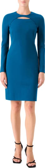 A curved front yoke winked with a keyhole adds an intriguing focal point to this otherwise minimalist sheath dress sewn from stretch-enhanced jersey.