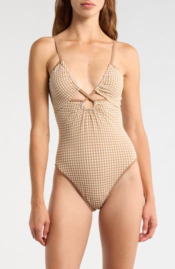 A flirty keyhole at the neckline and gingham print bring fierce dimension to this splash-ready swimsuit with full back coverage.
