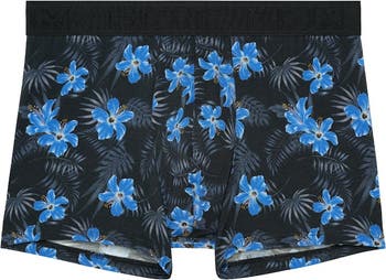- Tropical flower pattern contrasts with the dark background