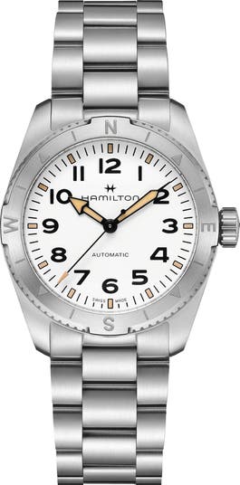 A Swiss-automatic movement provides reliability and precision on this military-inspired watch that's detailed with bold numerals and uniquely shaped hands. A Super-LumiNova® coating on the dial provides excellent legibility for easy timekeeping.