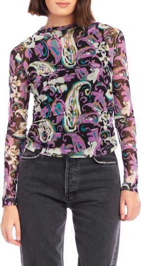 A swirling paisley print brings vibrancy to this gauzy mesh top crafted with soft shirring for a close fit.