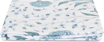 Dreamy flowers inspired by traditional Indian hand-blocked textiles bloom in greens and blues all over a crisp, cool fitted sheet made of Italian cotton percale.