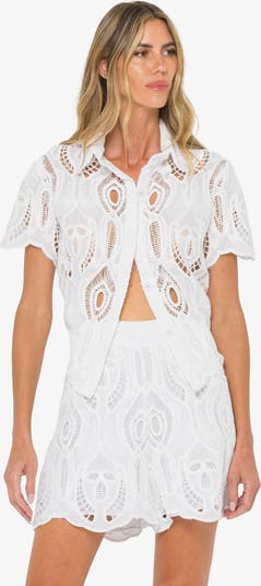 The Kia Shirt is a short-sleeve button-down shirt crafted in Regal Lace, showcasing an intricate and bold eyelet pattern. Designed with a classic collar, scalloped hem, and relaxed fit, it offers an effortlessly chic look. Lightweight and breathable, it’s perfect for warm days or layered styling.