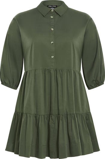 Billowy sleeves frame a winsome cotton-blend shirtdress fashioned in a tiered silhouette and finished with handy side pockets.