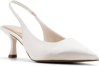 A pointy toe furthers the streamlined profile of a slingback satin pump featuring a dual-density foam footbed and sculptural heel.