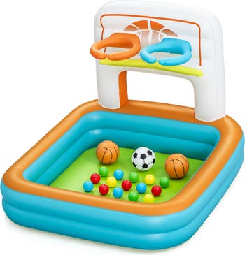 KICK 'N SWISH: 3-IN-1 MULTI-USE BALL PIT - 47" X 42" X 33" - Dribble, shoot and score with the Bestway Kick ‘N Swish 3-in-1 Ball Pit! On one side, double basketball hoops mimic the popular arcade game. Kids' free throw contests are made even better with the attached basketball return ramp. When you want to use the standard ball pit, just roll up the ramp, toss in the 15 play balls, and let the kids sink into fun! Then, on the backside of the ball pit, there’s a soccer goal for kids to practice their accuracy for another way to play. The basketball hoops, soccer goal, and ball pit are a winning combination for a day full of fun with the Kick 'N Swish 3-in-1 Ball Pit. BENEFITS OF DEVELOPMENTAL PLAY: Ball pits are great toys for working towards developmental milestones because they include many different types of activities. Games including play balls help children develop their fine motor skills by working on hand-eye coordination and basic levels of dexterity. Likewise, any chance to play with other children is a great opportunity to work on their confidence and communication by encouraging your child’s self-esteem through interactive play. Bestway designs each ball pit with developmental milestones in mind, so your little ones can continue to learn and grow! Suitable for kids ages 2+. Helps kids develop fine motor skills, confidence and communication. Size: 47 in. x 42 in. x 33 in. Dual basketball hoops for free throw contests. Retractable curtain works as a basketball return ramp when open and can be rolled up when used as a ball pit. Score points by shooting into the goal on the soccer wall. Great for indoor & outdoor use.