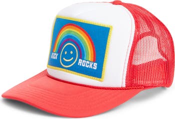 Breathable mesh panels back a trucker hat that kills with a smile.