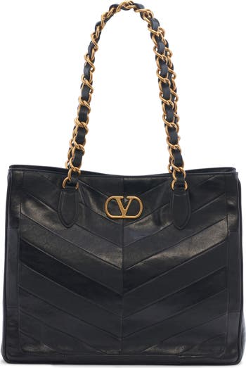 Diagonal patchwork is carefully mitered for a handcrafted effect on this spacious tote fitted with golden chain straps threaded in narrow leather strips.
