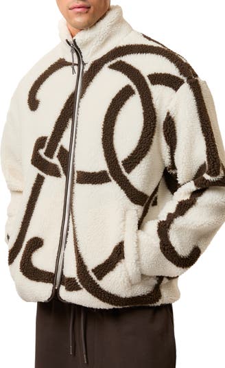 The brand's scripted initial boldly patterns a cozy jacket made from high-pile fleece.