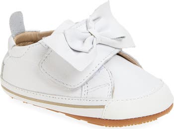A lightweight design and nonslip, flexible sole ensure steady steps for wobbly walkers in this leather sneaker topped with an adjustable strap and bow.