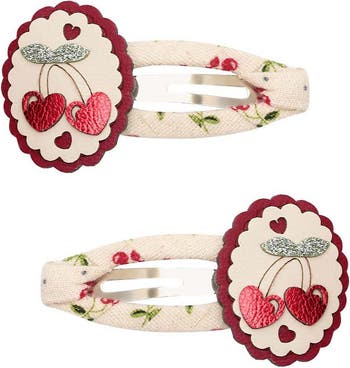 Cheerful cherries put the perfect finishing touch on this set of scalloped hair clips detailed with sparkly accents.