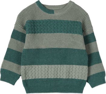 Here's a fresh new take on the classic boys' sweater, perfect for kids who value both style and comfort. It comes in a cotton-rich blend for skin-friendly softness, with 10% wool for additional cozy warmth. Plus, it boasts trend-right details, such as the 2-tone crewneck and contrasting rib-knit textures.