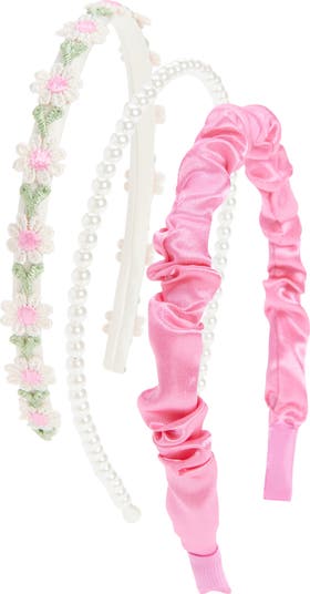 Put the perfect finishing touch on your young trendsetter's ensembles with this pack of headbands covered with ruched satin, faux pearls and delicately embroidered flowers.