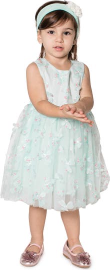 Three-dimensional butterflies and florals stand out against the frothy tulle shaping this twirl-ready party dress.
