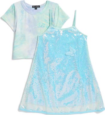 They'll love the fluttery butterflies that grace the front of this sequined dress paired with a coordinating tie-dye T-shirt.