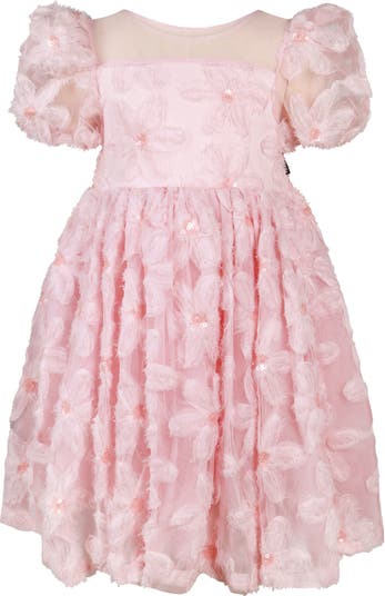 Fringy 3D flowers accented with light-catching sequins adorn a dreamy tulle party dress designed with an illusion neckline and puff sleeves.