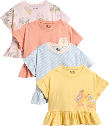 This pack of four ruffle-hemmed cotton T-shirts includes an assortment of solid, stripe, print and appliquéd designs dyed in sherbet colors.