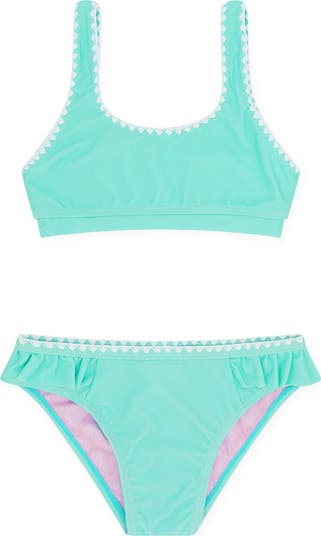 Ruffles frill the bottoms of this playful two-piece swimsuit made from fast-drying fabric that offers UPF 50+ protection, too.