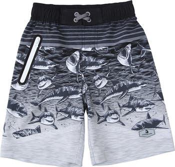 4-way stretch swim trunks with mesh lining for comfort. Quick-drying fabric, elastic drawstring closure, side zipper pocket, and UPF 50+ protection.