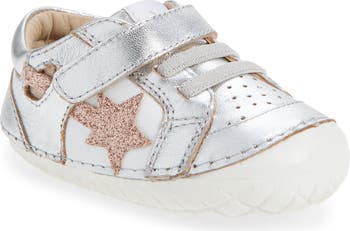 A lightweight design and nonslip, flexible sole ensure steady steps for wobbly walkers in this leather sneaker secured with stretchy laces and an adjustable strap.