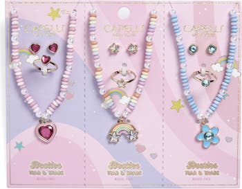 Help your kid celebrate their friendships with this collection of sparkling necklaces, rings and earrings fit for a trio of besties.