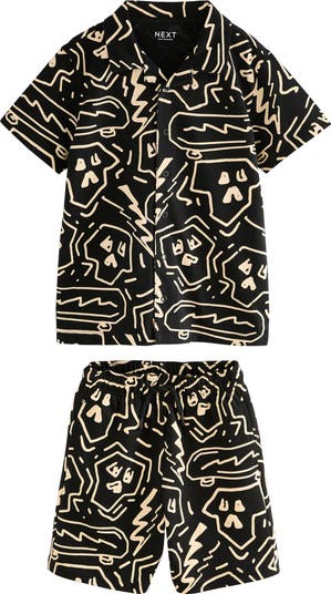 A soft cotton knit printed in abstract patterns makes a sunny-day go-to of a camp shirt and matching shorts designed to keep your kid comfy indoors and out. They look great together and pair easily with your child's other favorite clothes for changing up a look without beefing up your budget.
