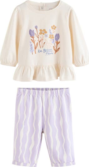 Your tiny trendsetter can channel the color and vibrancy of a flower with this comfy set featuring a ruffle-hem top and a pair of coordinating wavy-stripe pants.