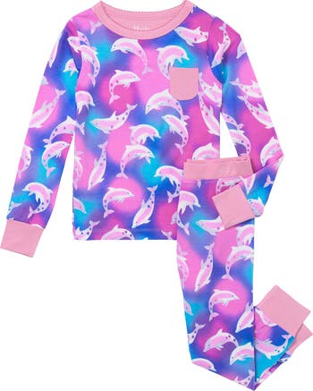 Soft and stretchy pajamas are printed with dreamy dolphins and finished with contrast—including a fun patch pocket.