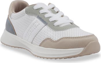 A perforated upper lends superior breathability to low-profile sneaker grounded by a sturdy rubber sole.
