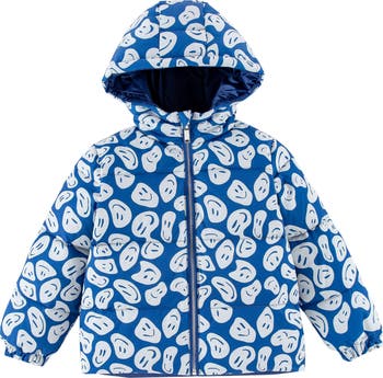 Your little one will be ready for cold weather with this hooded puffer jacket insulated with heavyweight down for coziness and warmth. It's crafted with a reversible design that switches from a quilted, happy face-print side to a smooth, solid color for two looks in one.