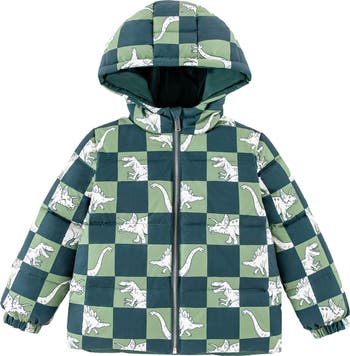 Your kiddo will be ready for cold weather with this hooded puffer jacket insulated with heavyweight down for coziness and warmth. It's crafted with a reversible design that switches from a quilted, dino-print side to a smooth, solid color for two looks in one.