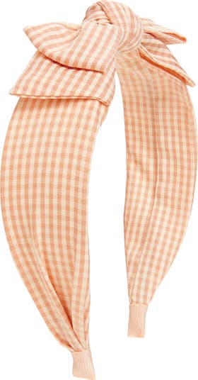 A knotted bow made from peach-hued gingham tops this sweet headband that holds back tresses in style.