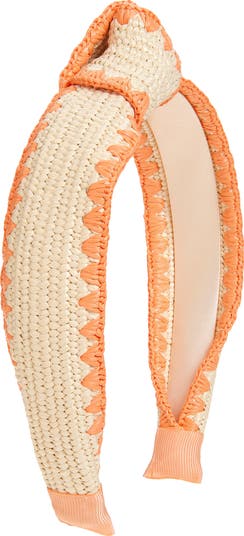 Raffia-like fabric covers this smooth satin headband edged with pretty peach shell-stitch embroidery and topped with a knot at the crown.