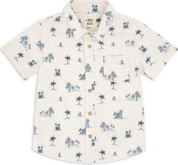 Island prints bring vacation vibes to this breathable, stretch-woven button-up shirt that keeps your kid looking smart and feeling comfortable.