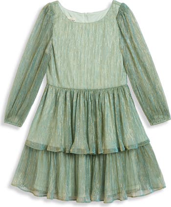 Twirling and shining will be what your kiddo does best in this metallic party dress pleated and tiered to perfection.