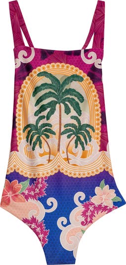 Pool days, vacations and fun in the sun beckon your kid in this reversible one-piece swimsuit with bold placement prints and adjustable back tie closure.