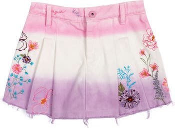 Vibrant embroidery inspired by the tropical wonderland of Brazil blooms on these kid-sized denim shorts that look like a raw-hem skirt from the front.