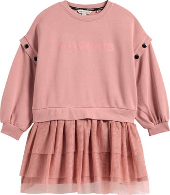 A tiered mesh skirt brings ballerina vibes to this cozy, layered dress punctuated with logo-engraved faux snaps for a bit of edge.