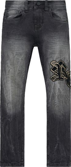 These kid-size skinny jeans are made for comfort from stretchy denim and finished with an embroidered graphic at the thigh.